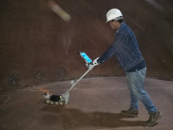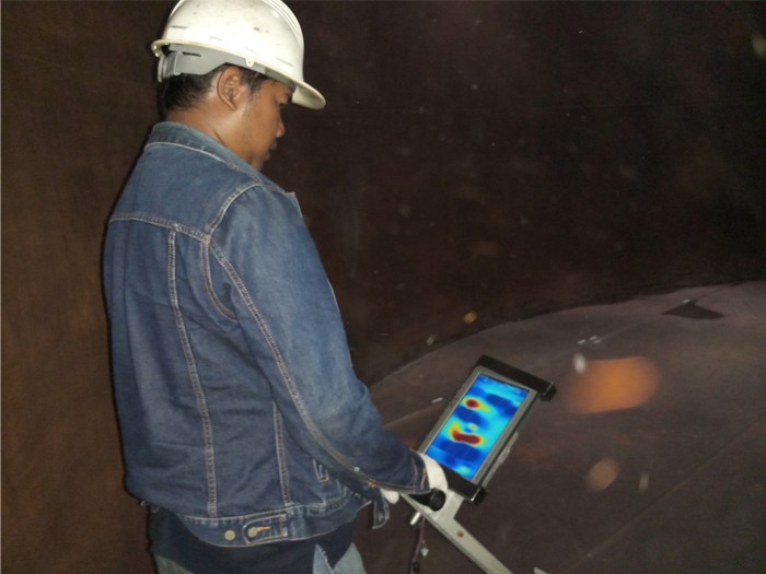 Magnetic flux leakage is a corrosion test of the tank floor. Tank Floor Scanning is a qualitative method to detect soil corrosion in the bottom slab of above-ground storage tanks using magnetic flux leakage (MFL) technique. It uses a magnetic field to detect corrosion and pitting in carbon steel. The MFL uses a powerful magnet to attract the bottom of the steel drum. Magnetic leakage from corrosion defects or material loss is detected by the MFL 3D sensor. MFL can provide discrimination between top and bottom surface defects.